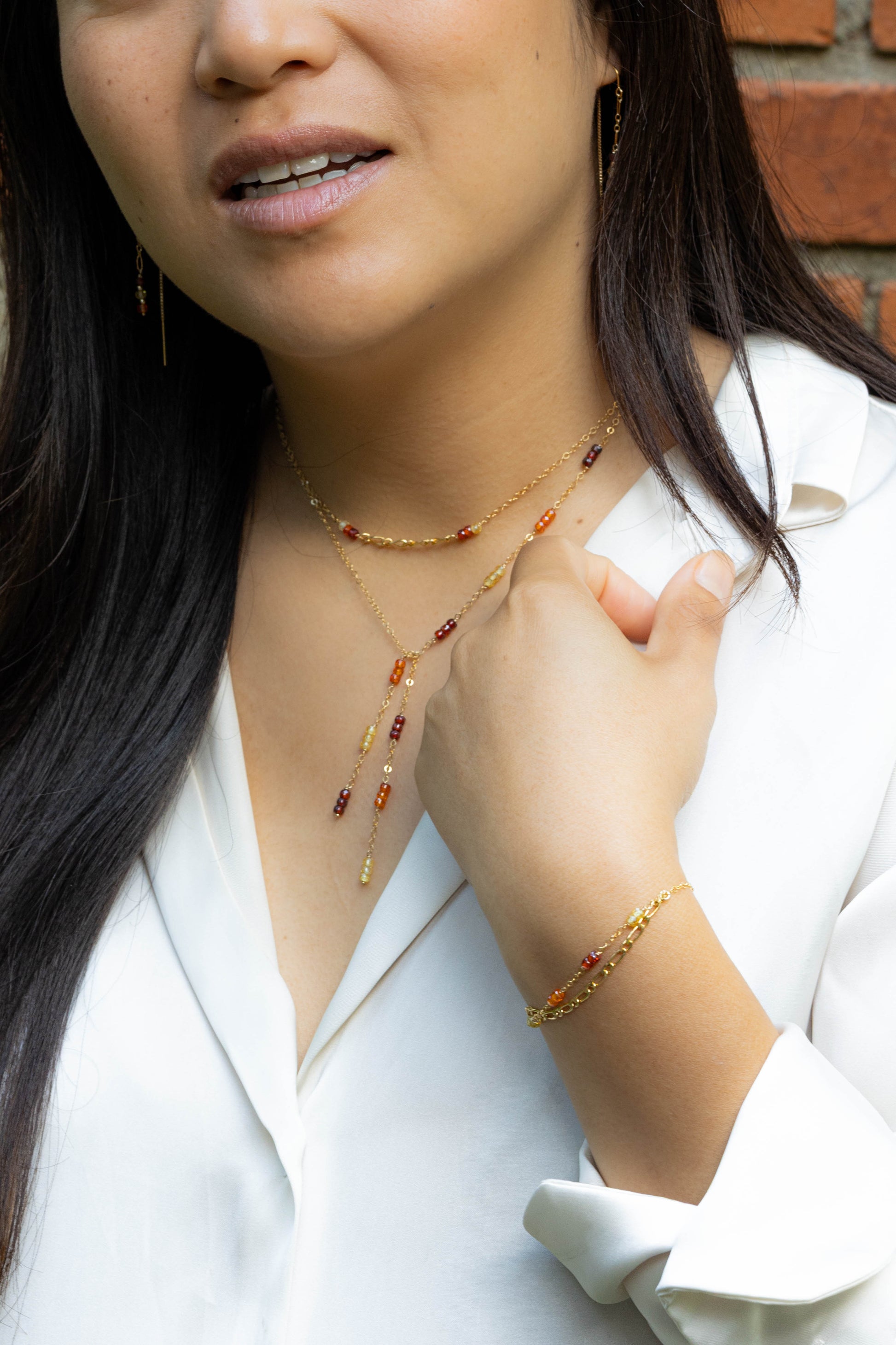 Un trio de pierres naturelles — Cornaline, Citrine et Jaspe jaune — capte la lumière et révèle des reflets chauds et solaires à chaque mouvement.
