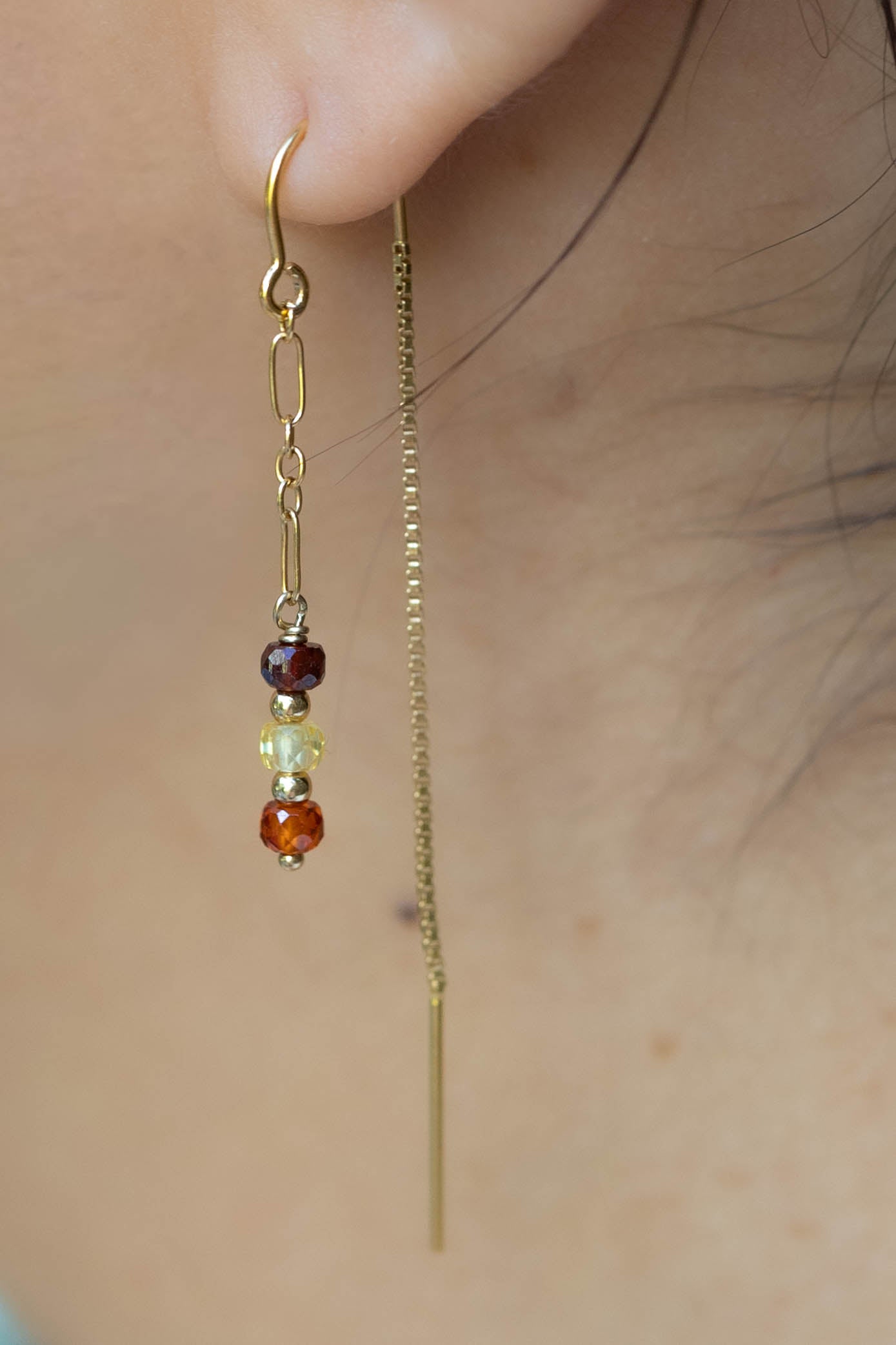 Les chaînes délicates en plaqué or se terminent par un trio de pierres naturelles — Cornaline, Citrine et Jaspe jaune — aux reflets chauds et chatoyants.
