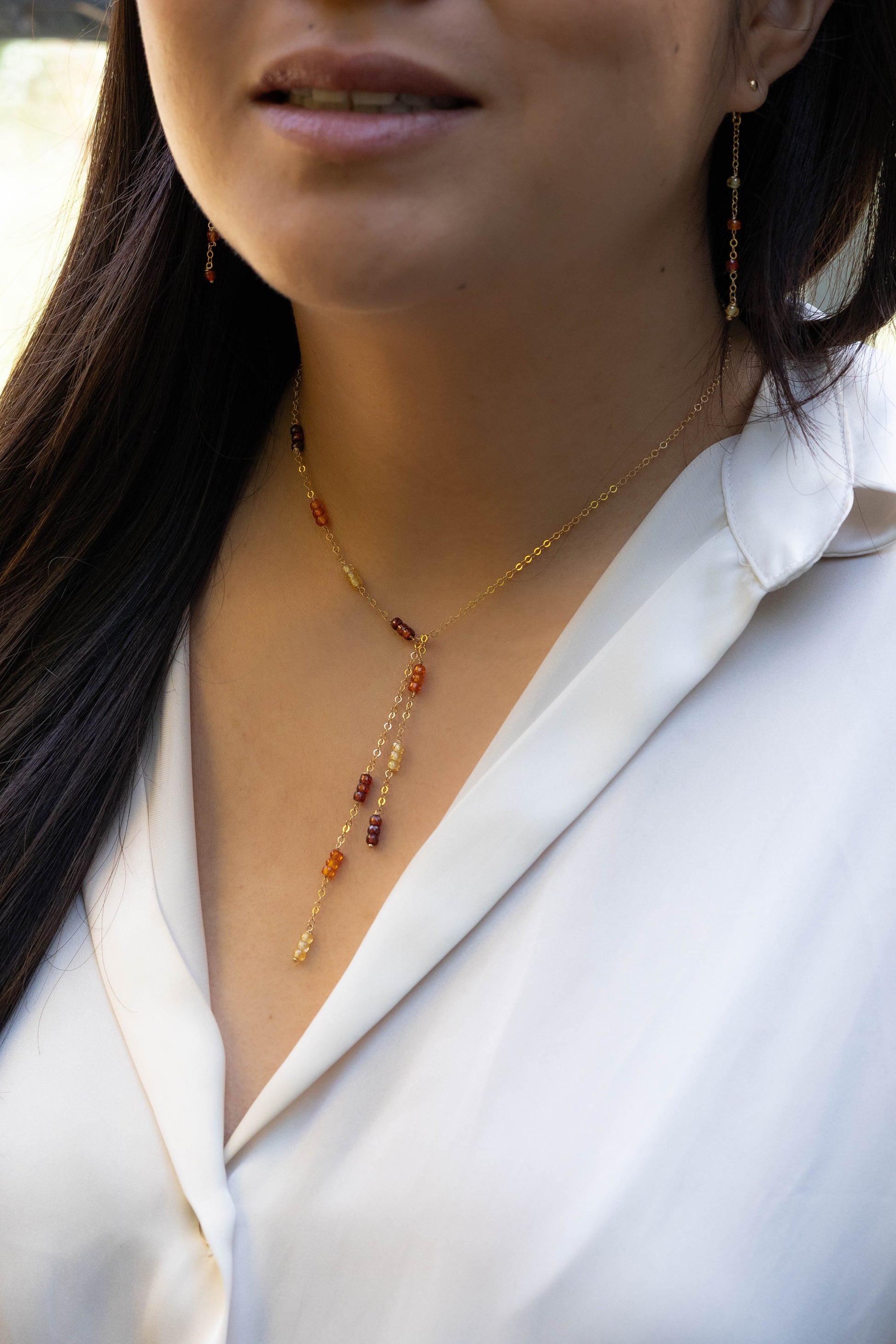 Ce collier cravate capture la chaleur et la lumière avec ses jolies pierres naturelles.