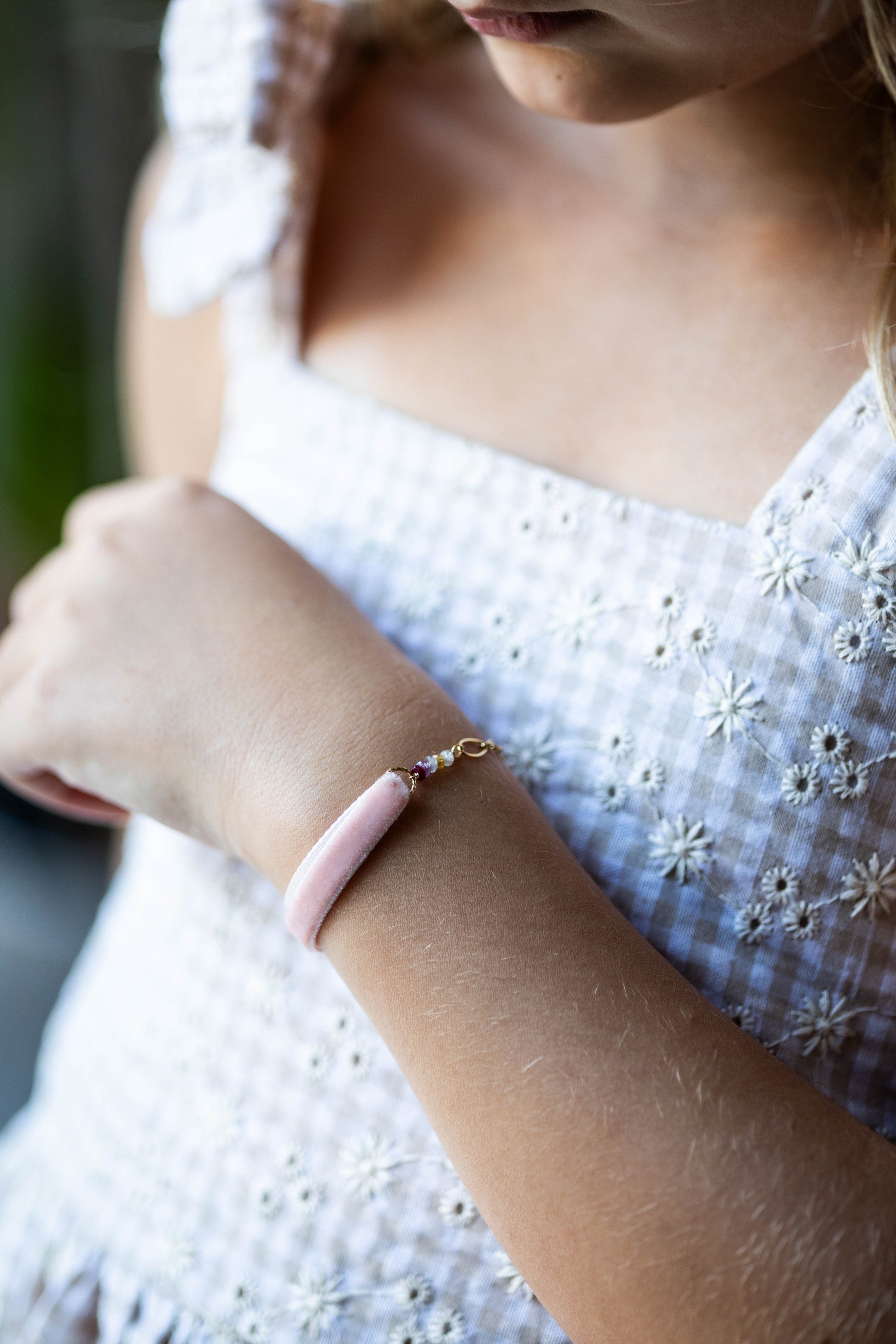 Cet ensemble réunit deux bracelets délicats, composés d’un élégant ruban de velours rose et de fines perles facettées multi-saphirs, aux reflets subtils et lumineux.
